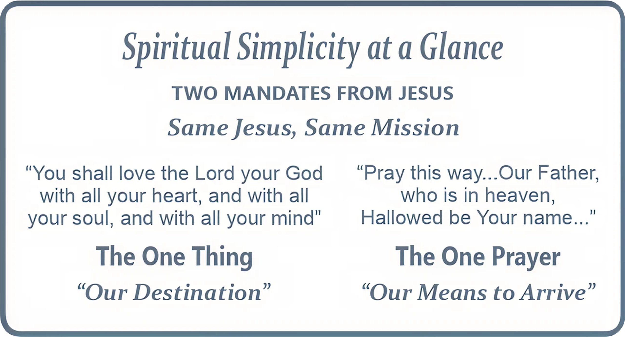 Since THE ONE THING and The One Prayer both came from the heart of Jesus, they must be great truths that reinforce one another. The more you learn about and practice The One Prayer, the more you realize the intentionality behind every word Jesus uttered.